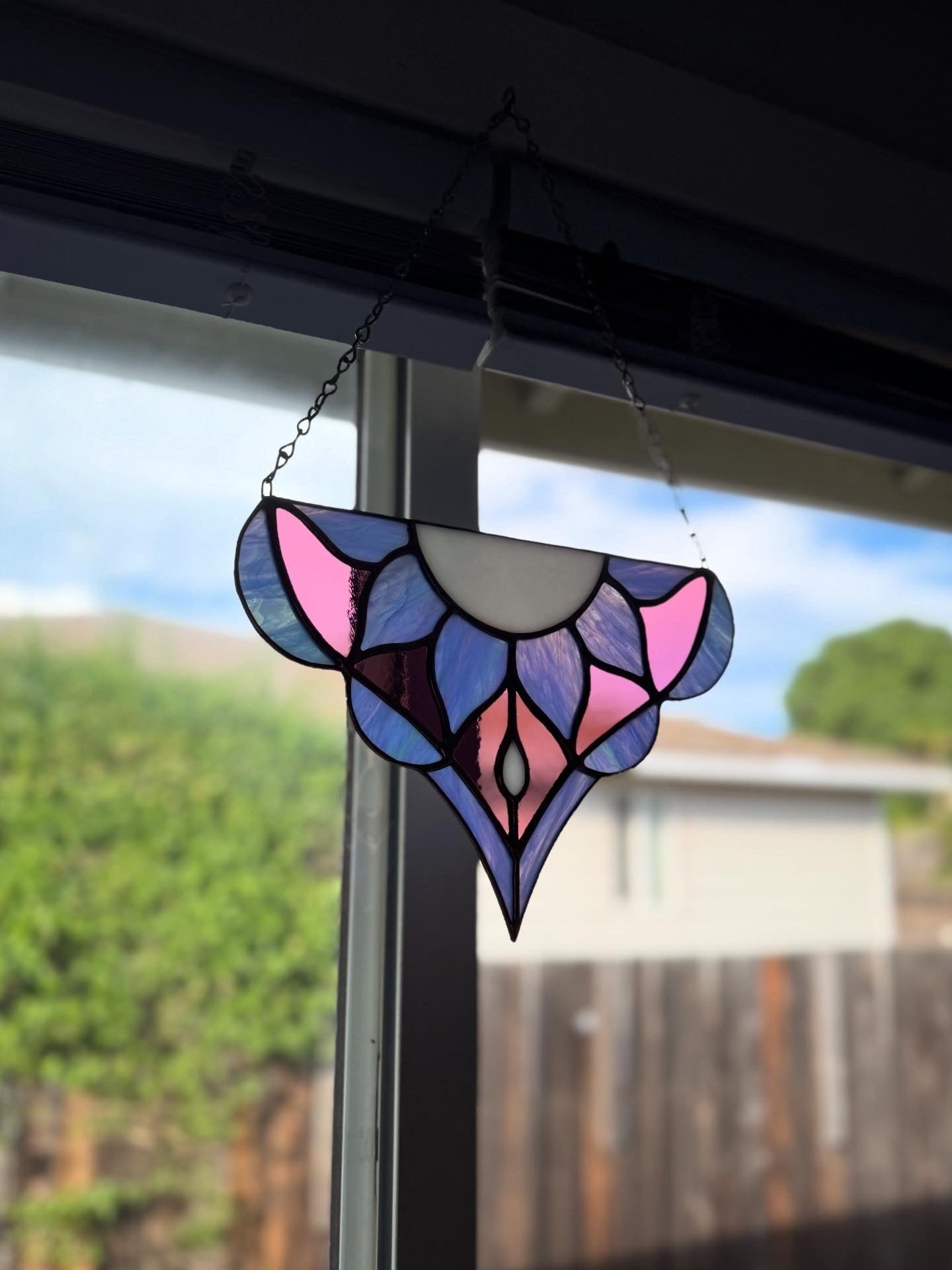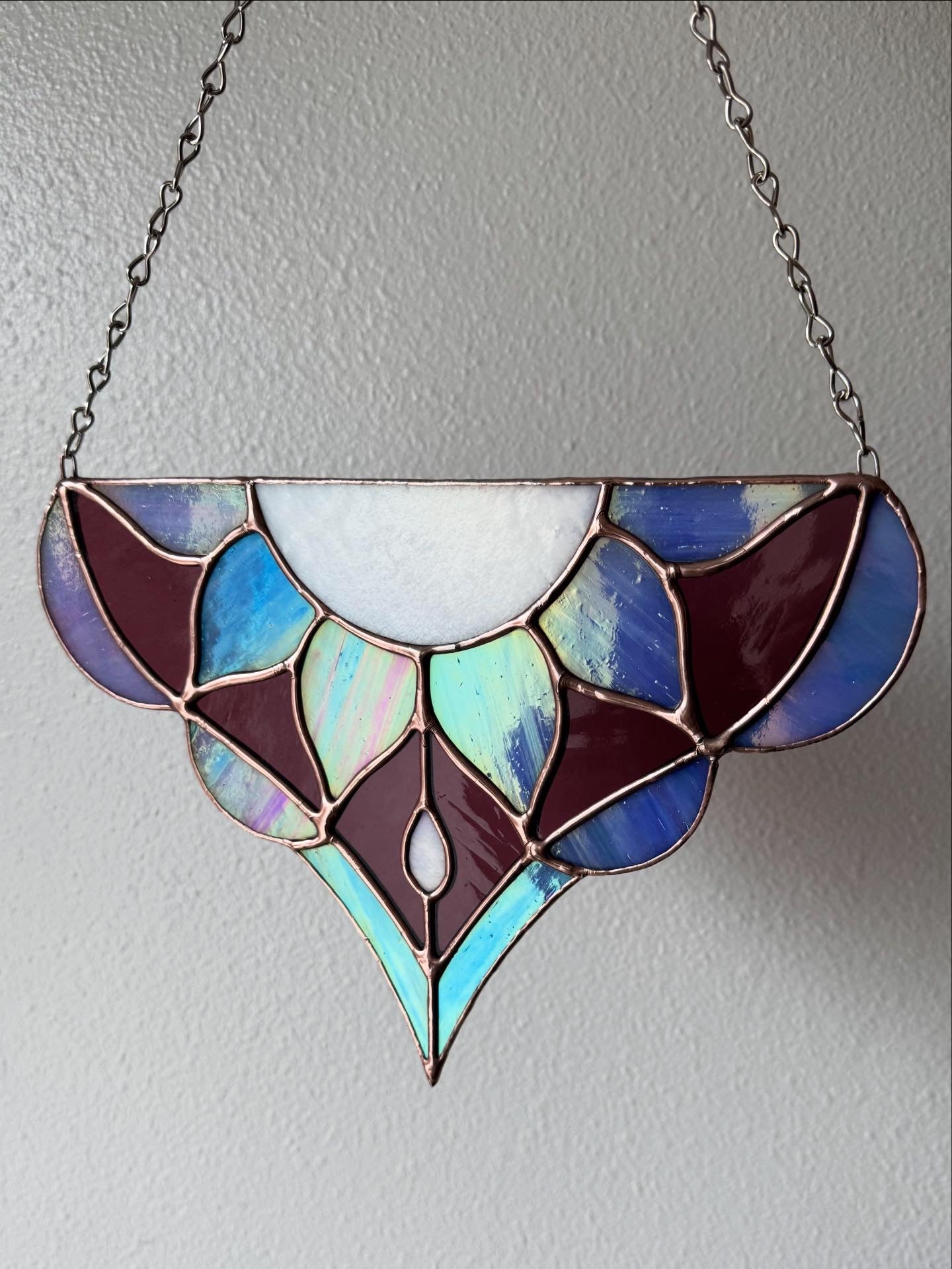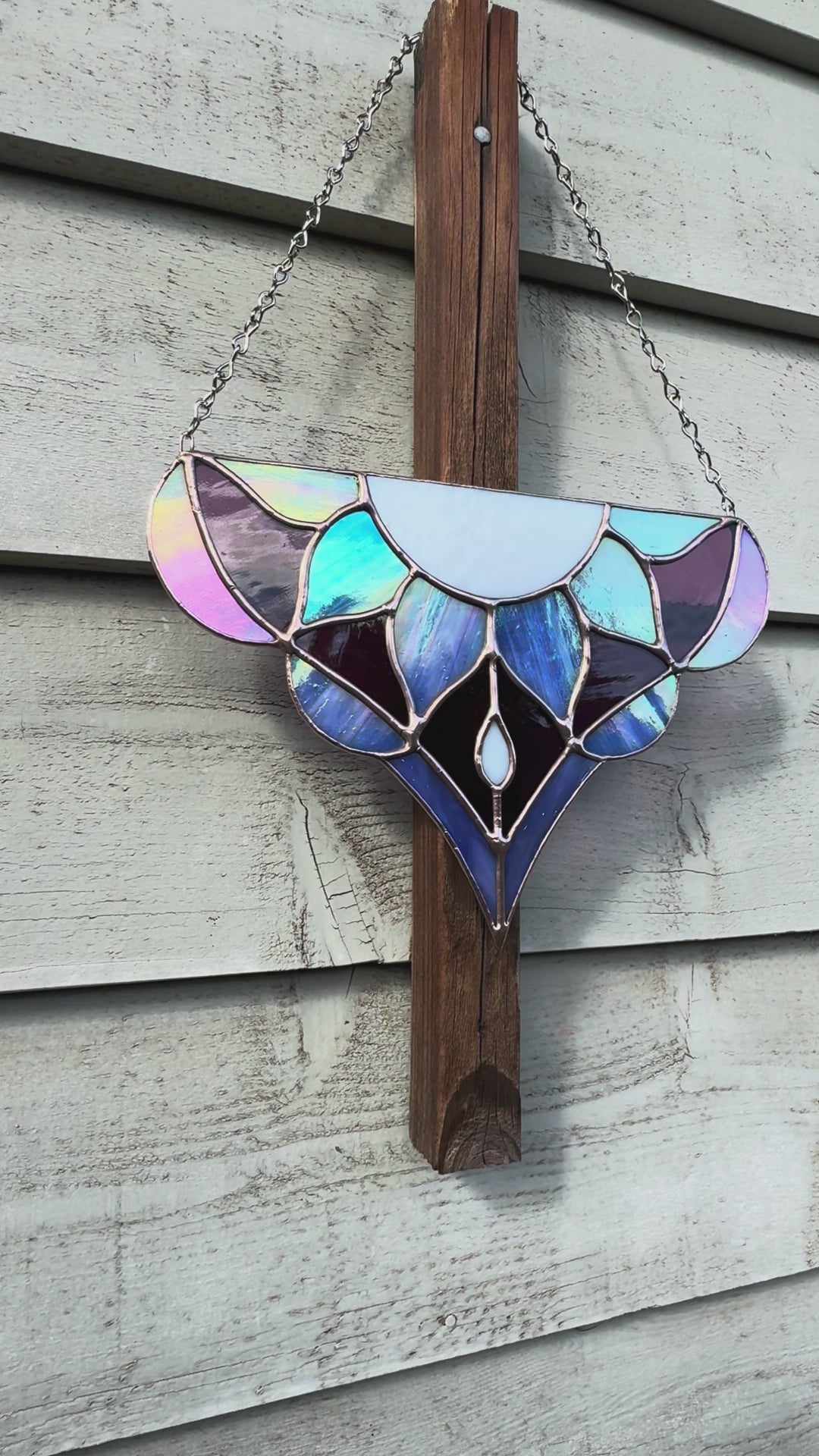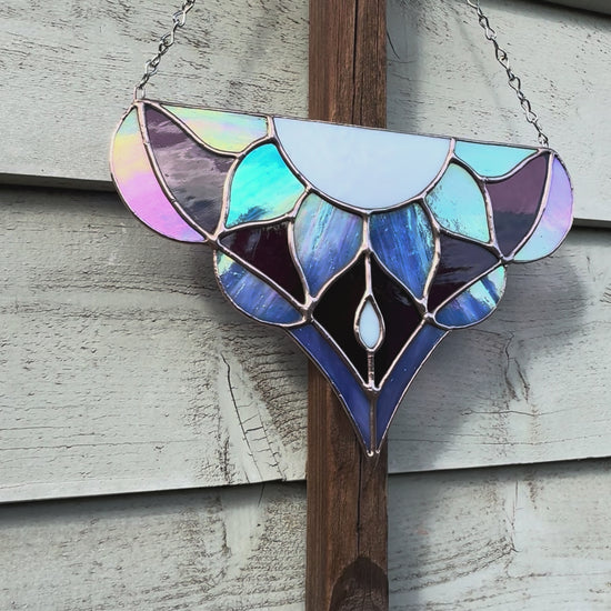 This piece is simple yet elegant, featuring iridescent glass it catches the light and looks amazing in a window or hung on the wall.